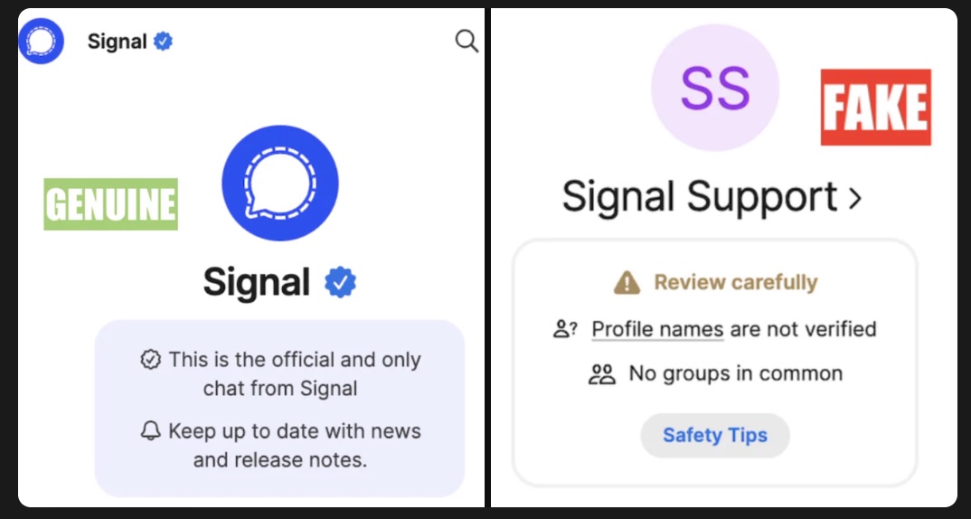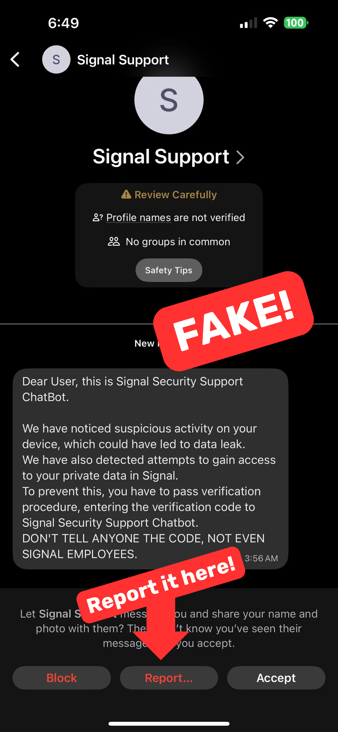 There have been an increasing number of fake messages from "Signal Support" that are attempting to hijack your account.